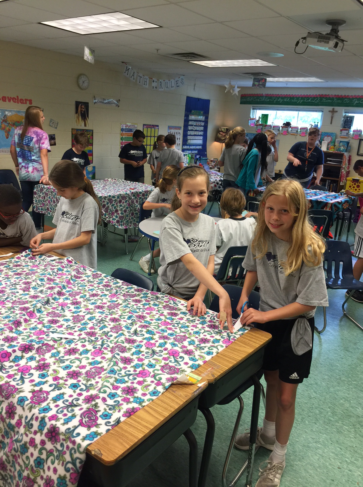 As Brenda explained during her visit St. Catherine’s, the goal of the program is to bring more self-esteem and joy to local children by helping their families make their birthday wishes come true. As part of the feast day, the third graders made My Birthday Matters care packages that included backpacks, crayons, markers, stickers, erasers, coloring books and handmade birthday cards. Fourth graders made fleece blankets. Throughout the day, eighth graders served as leaders and helped the younger kids understand why what they were doing was important.