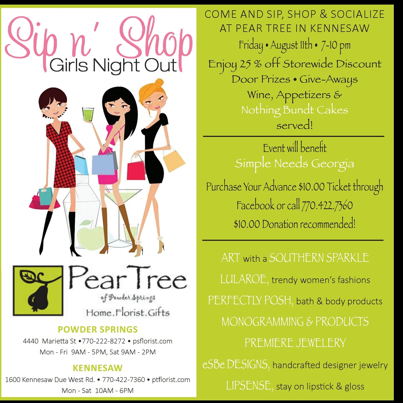You can buy an advanced $10 ticket through PearTree’s Facebook page or call 770-422-7360. Kim is asking everyone who drops by to “sip, shop and socialize” to make a $10 donation to SNGA. The event starts at 7 and ends at 10 p.m.