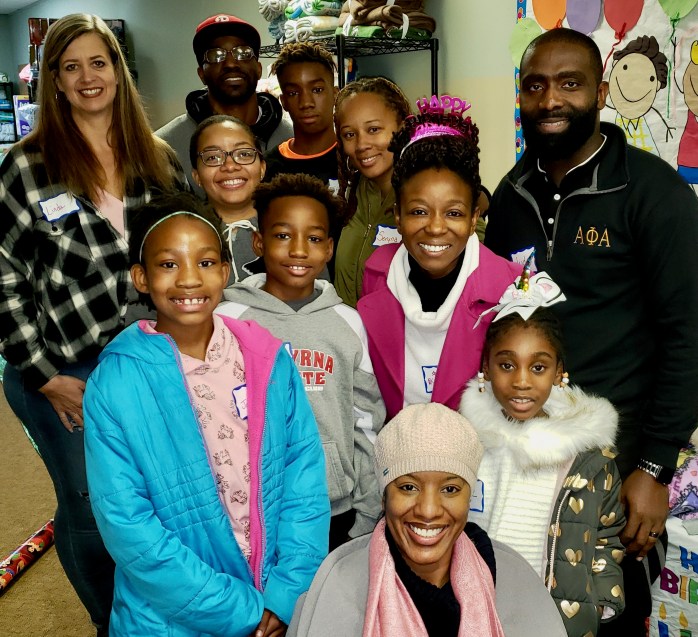 Gratitude to Kerbie Marc for marking her birthday by teaming with family and friends to support people in need. Kerbie is a school counselor for Marietta Sixth Grade Academy. On Nov. 2, she and her husband, Judesther, along with their daughter, Sophie, joined some friends to pitch in for several hours at our Marietta warehouse. “The Marcs amplified their impact by sharing our list of needed items with others,” Brenda said. “We were excited that Kerbie and her family and friends wanted to spend her birthday with us. We even put a party hat on her when she arrived so that everyone knew it was her big day! And one of the families with SUVs also pitched in by delivering furniture and other items to our clients, for which we were very grateful.”